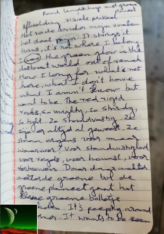 Generally, my first choice of (written)language is English. All my (previous travel) blogs and my novel are in English. However, now I live in the Netherlands and all my fellow writers during online writing sessions are Dutch; hence we write in Dutch. A few weeks ago, during one of these online sessions we were given a visual as a ‘free writing’ prompt. If you’re able to read a bit of the scrawled writing in my notepad, then you’ll notice -what I realized after laying down the pen- I had code-switched!