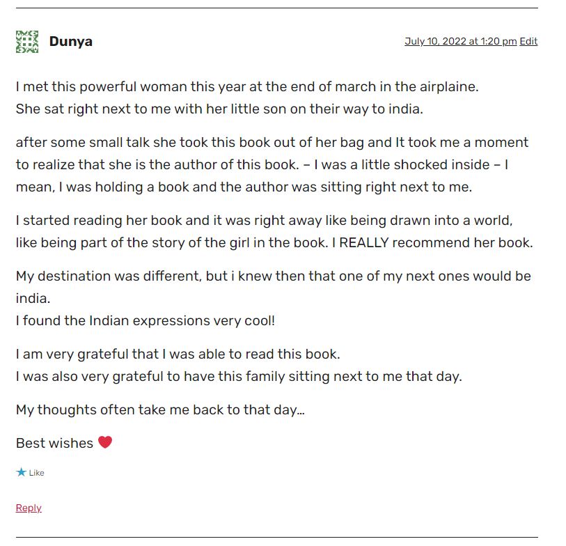 Such lovely words from a reader. It truly was serendipity that Dunya (meaning world) sat next to me on that plane. A young cross-cultural woman, on her way to explore the world